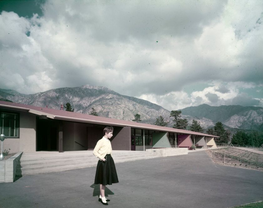Photo from the Getty Research Institute. Shulman, Julius, photographer, and Smith, Powell & Morgridge, architect. Job 1909: Smith, Powell, and Morgridge, Sierra Mesa School (Sierra Madre, Calif.), 1955.